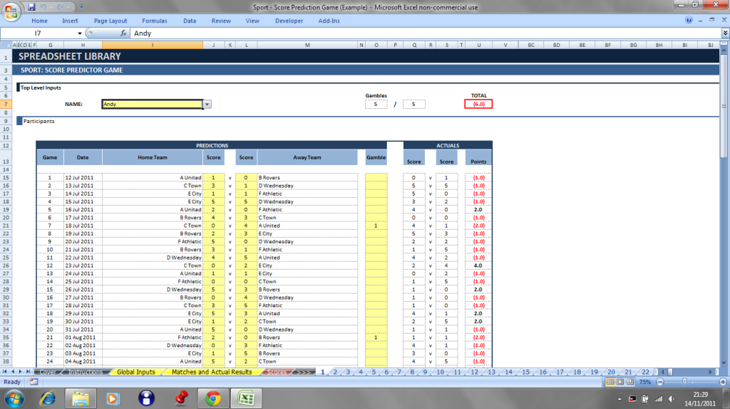 With this tool you can easily administer a score prediction game with your friends or work colleagues. Distribute the entry forms to participants for them to enter their predictions, input them into the model, and define the points awarded for perfect score, correct results etc.
